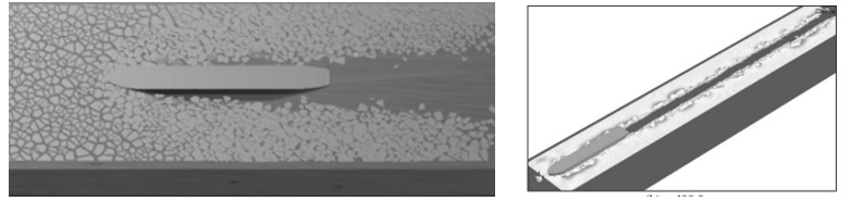 Рис. 7. Численное моделирование методом дискретных элементов ледового сопротивления судна в битом льду и прокладка канала ледоколом в сплошном льду [28–30].