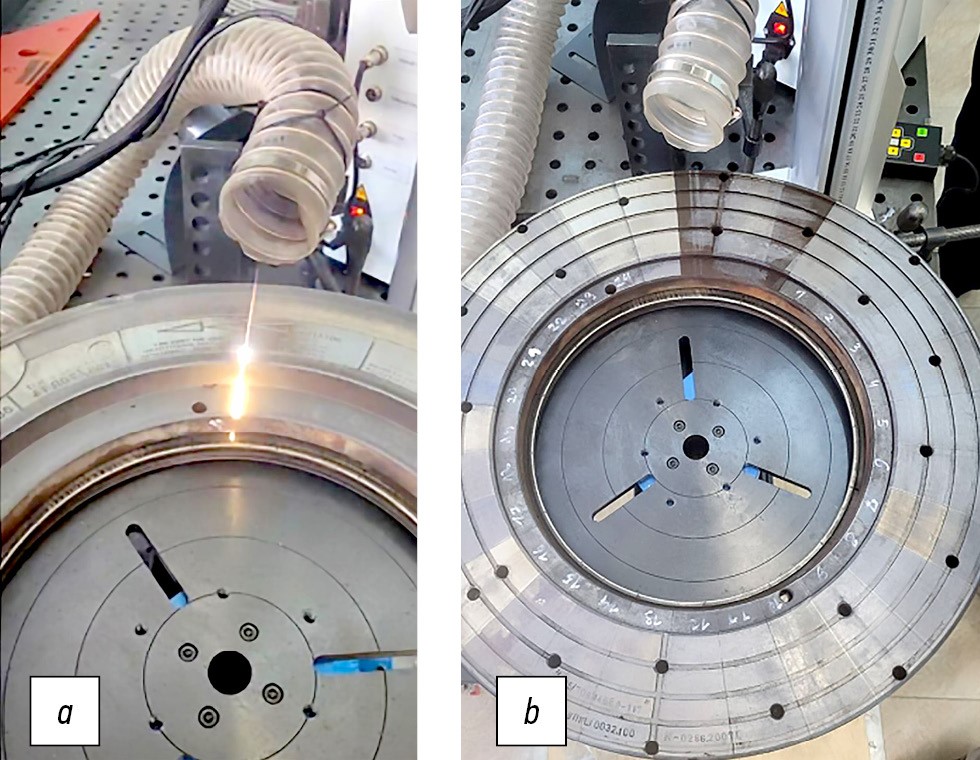 Рис. 2. Фотографии поверхности со слоем остаточных органических продуктов от нагрева эластомерного материала на вулканизационной форме из стали 40Х с диаметром 556 мм (применяемой в шинном производстве на ОАО «Белшина») в ходе проведения нами лазерной очистки и после нее: a — вид изделия в ходе эксперимента по лазерной очистке; b — очищенная после лазерной очистки поверхность, в верхней части снимка на изделии оставлен неочищенный от исходных органических веществ конусный сектор (он виден по резкой границе серой окраски).