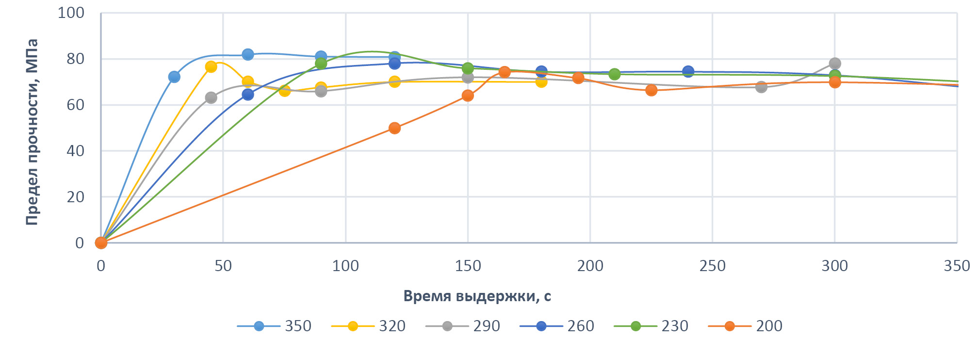 Рис. 4. Зависимости роста прочности полимера от времени оплавления при разных температурах.