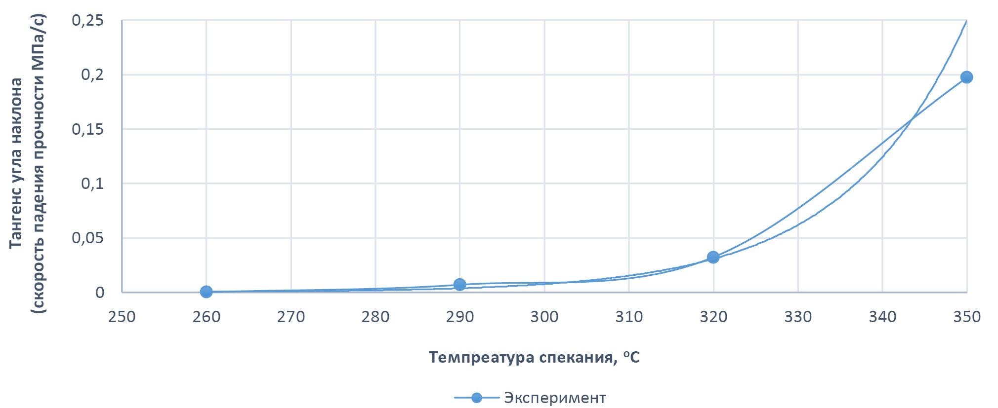 Угол наклона прямых, согласно рис. 4, зависит от температуры. В свою очередь тангенс угла наклона прямой соответствует скорости роста прочности полимера при расплавлении отдельных частиц. График зависимости тангенса угла наклона прямой (скорости роста прочности) от времени спекания, приведен на рис. 5.