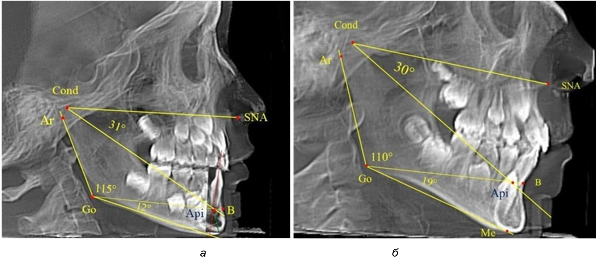 Через апикальную точку нижнего резца от суставной точки проводили линию Cond-Api, которая с линией Cond-SNA образовывала угол гнатический части лица SNA-Cond-Api, используемый для оценки ее основных параметров.