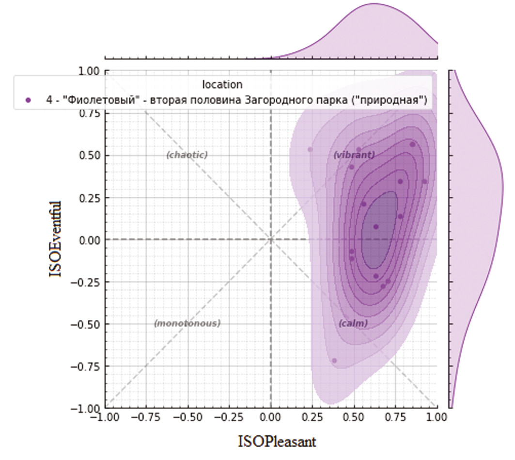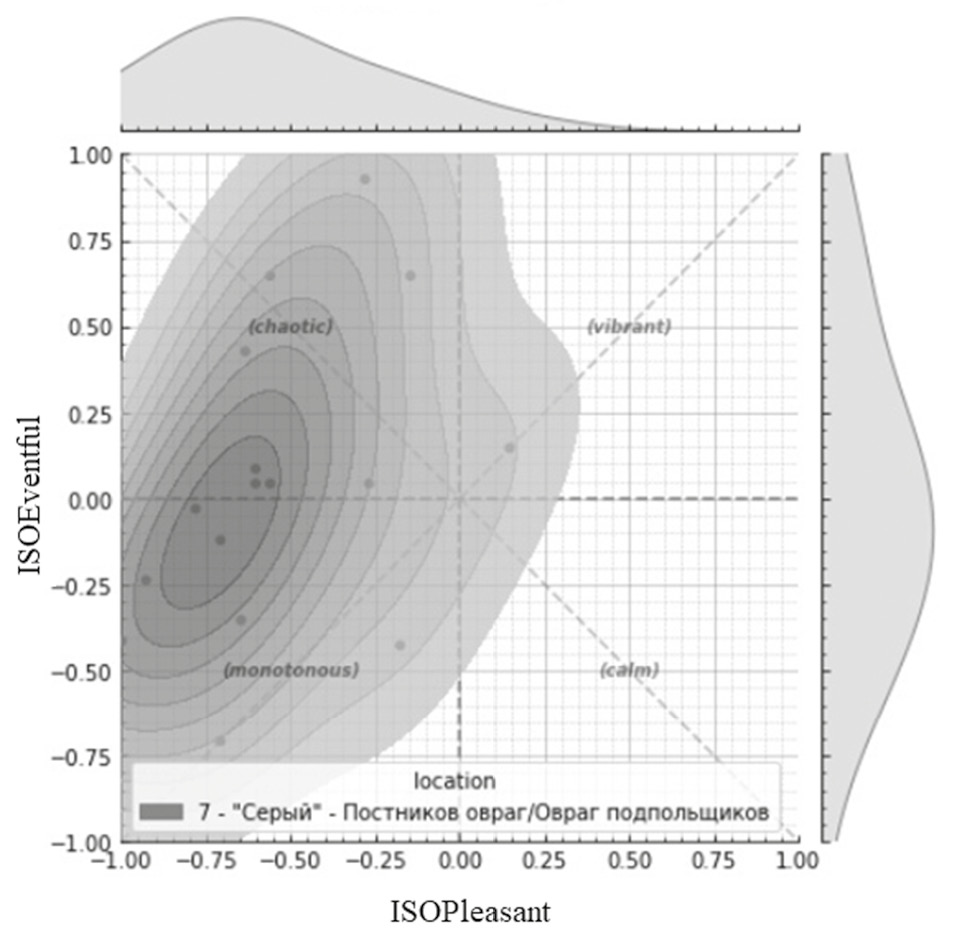 По прохождению всеми информантами анкетирования был проведен анализ ответов, касающихся испытываемых впечатлений и эмоций от окружающих звуков. Была написана программа на языке Python, которая с помощью библиотеки «Soundscapy», предназначенной именно для оценки звукового ландшафта, позволяет визуализировать данные и интерпретировать их [5].