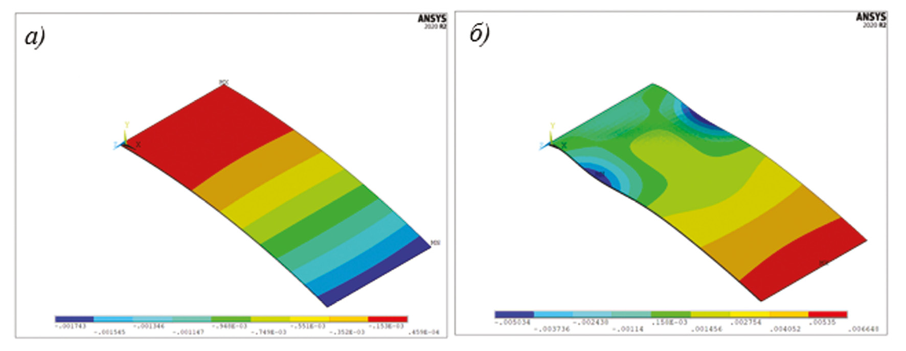Результаты. Полученные результаты в зависимости от закрепления в среде ANSYS можно разделить на два типа. В качестве результатов приведен прогиб точек пластины, показанный на рисунке 1. В первом случае для двумерной модели термоупругости наблюдаются схожие результаты с одномерной моделью. Также стоит отметить, что при уменьшении начального прогиба пластины двумерная модель качественно стремится к одномерной модели. При реализации второго типа закреплений происходит потеря устойчивости пластины. При x = 0,25 l пластина теряет свою первоначальную плоскую форму. Потеря устойчивости происходит из-за превышения критических напряжений по устойчивости.