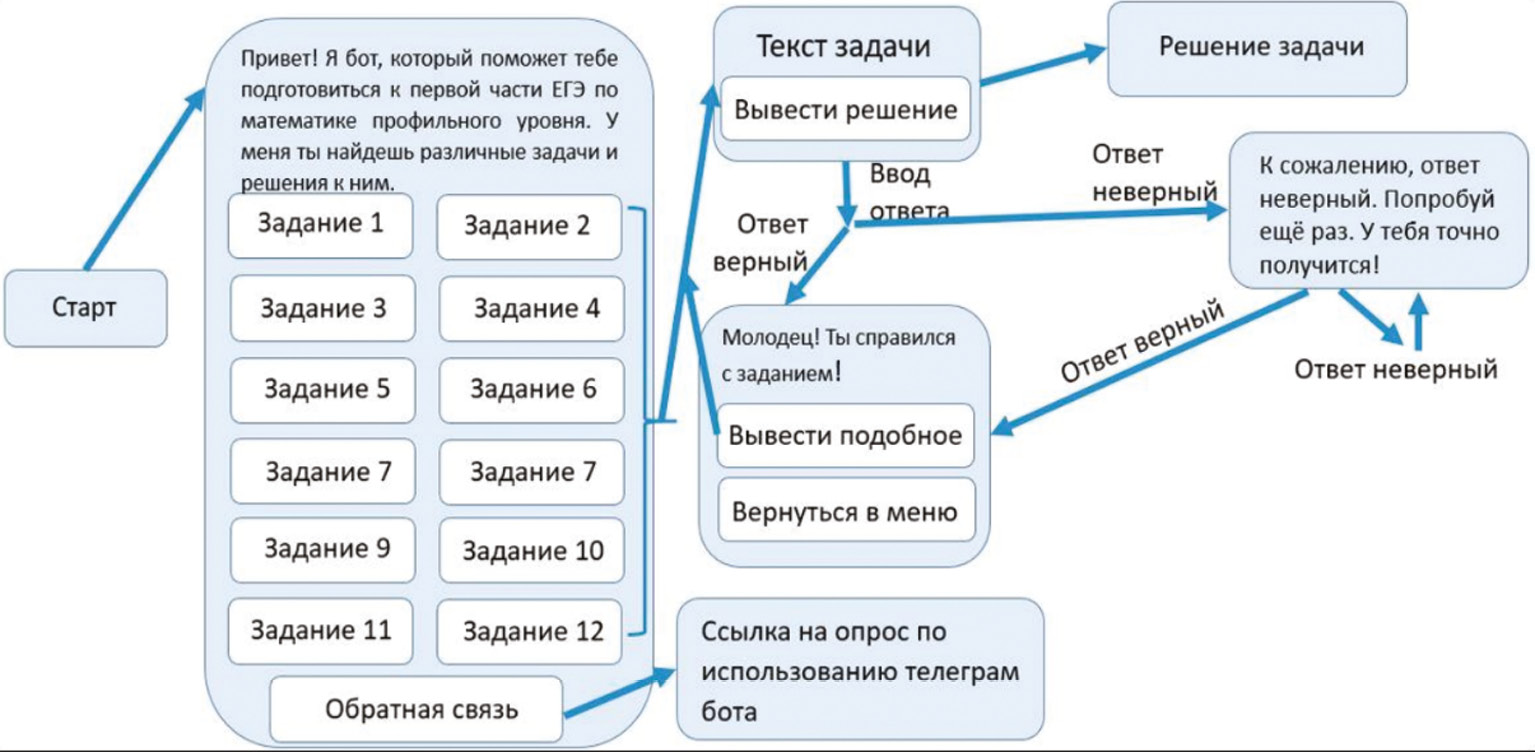 Методы. На основе проведенного анализа был создан алгоритм для телеграм-бота «ТыСдашь», реализующего подготовку к первой части ЕГЭ по математике профильного уровня (рис. 1).