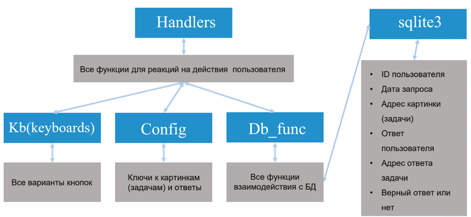 Для телеграм-бота была создана база данных, ее создание обусловлено необходимостью хранения адреса задачи, доставшейся пользователю, это необходимо для дальнейшего использования данного адреса для нахождения изображения, содержащего решение данной задачи (рис. 2) [8].
