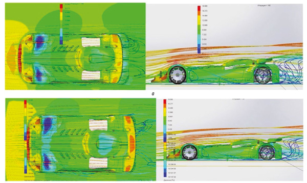 Рис. 3. Продувка корпуса: а — антикрыло смещено вперед; б — антикрыло смещено назад