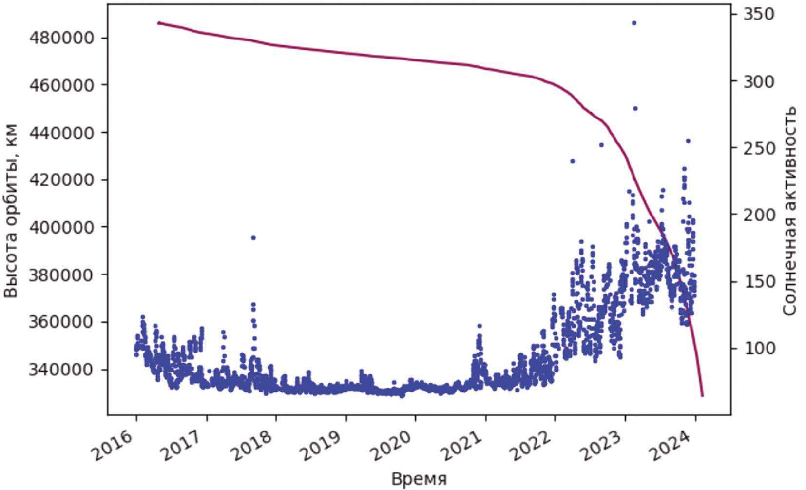 Одной из причин быстрой эволюции орбиты могут служить циклы повышенной солнечной активности, которые повторяются каждые 11 лет. Следует отметить, что такие периоды приводят к изменению плотности атмосферы, что, в свою очередь, может вызывать резкое снижение высоты орбиты МКА. На рис. 2 представлен график зависимости солнечной активности от времени за весь срок баллистического существования МКА «АИСТ-2Д».
