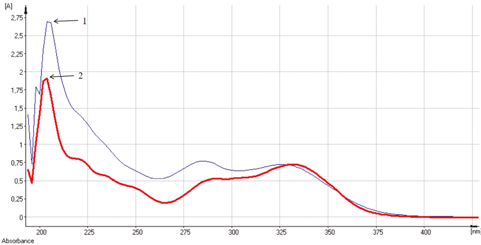 Рис. 1. Электронный спектр густого экстракта на 40 % этиловом спирте: 1 — спиртовой раствор стандартного образца розмариновой кислоты; 2 — густой экстракт на 40 % этиловом спирте