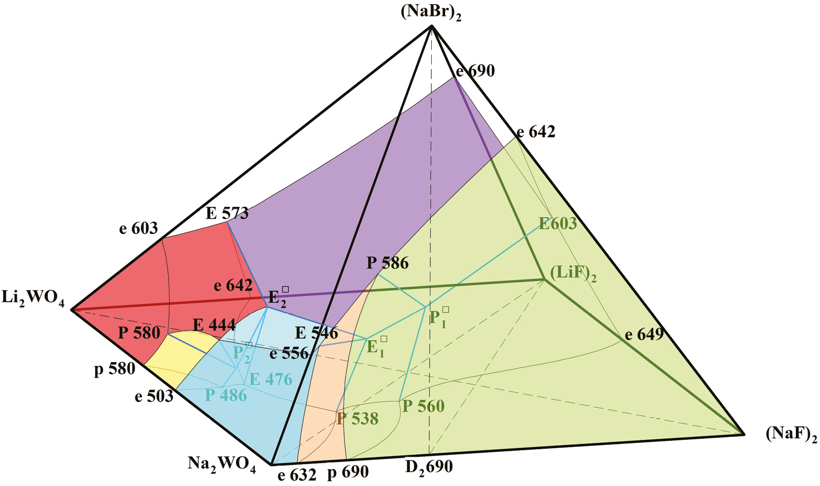 Цель — анализ и прогнозирование фазовых равновесий в стабильном пентатопе NaBr-Li2WO4-Na2WO4-LiF-NaF четырехкомпонентной взаимной системы Li+, Na+ || Br-, F-, WO42- при помощи 3D-моделирования.