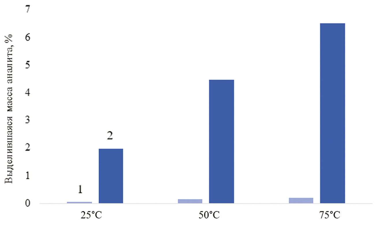 Выводы. Полученные экспериментальные данные подтверждают применимость МХДС для получения жидких сред с контролируемым содержанием аналита в условиях динамической экстракции. Установлено влияние температуры и типа монолитной матрицы на интенсивность высвобождения аналитов: системы на основе эпоксидной смолы обеспечивают медленное и стабильное высвобождение, в то время как полиэфирные — ускоренное и более интенсивное. Постоянство получаемых концентраций органорастворимых аналитов для МХДС на основе эпоксидной смолы наступает при прохождении через образцы 200 см3 экстрагента, а для систем на основе полиэфирной смолы — при прохождении 500–600 см3 экстрагента.