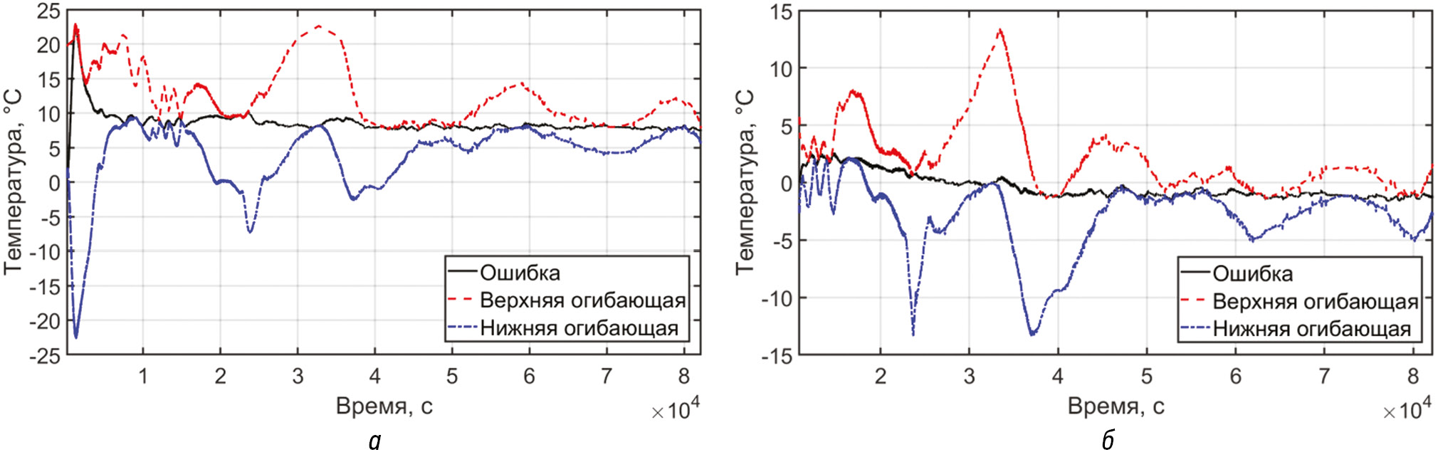 Рис. 1. Температурная невязка: а — расчет на полном интервале времени; б — расчет на участке стабилизации температуры